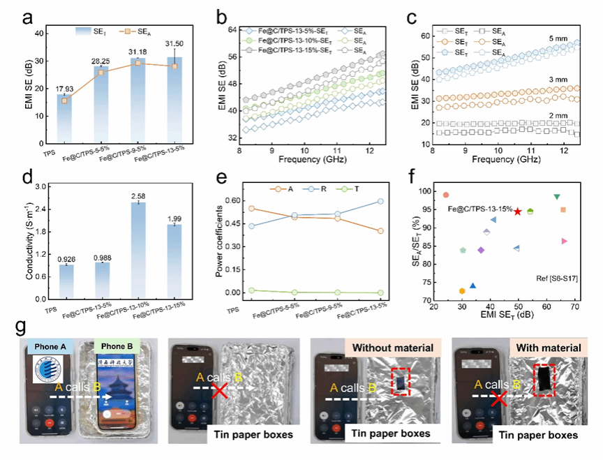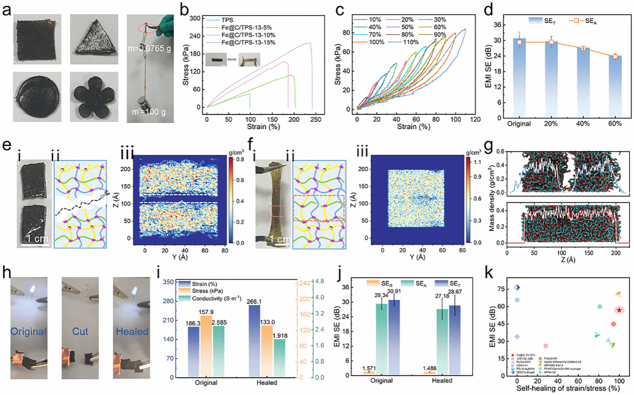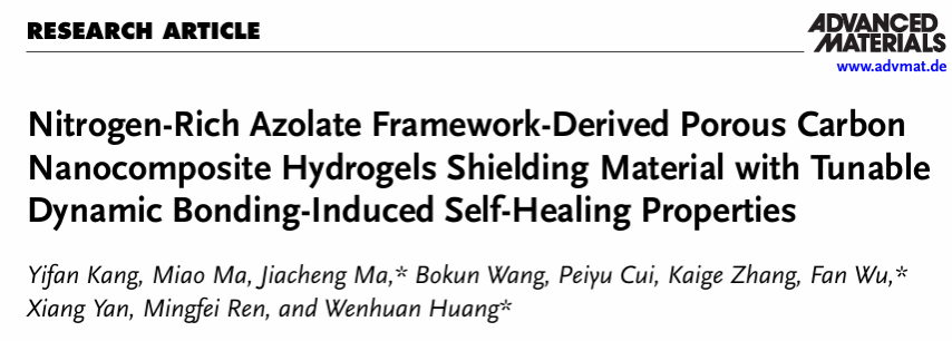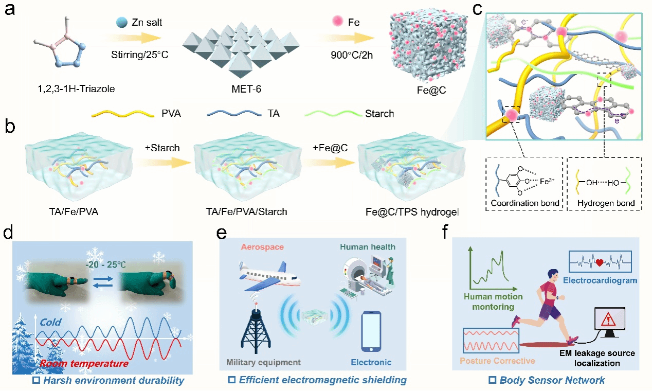 随着第五代(5G)乃至第六代(6G)通信技术、可穿戴电子和柔性传感的飞速发展,电磁干扰(EMI)与辐射污染已成为不容忽视的问题。传统的金属屏蔽材料虽效能卓越,但其固有的刚性、易腐蚀及难以集成等缺点,无法满足新一代柔性设备对可拉伸、自愈合及环境适应性的苛刻要求。导电水凝胶因其独特的导电网络、优异的机械柔性和生物相容性,被视为理想候选者。然而,常规水凝胶面临低温冻结、易失水、机械强度与自愈合性能难以兼顾等瓶颈。近日,化学与化工学院黄文欢教授课题组与合作者在柔性电磁屏蔽材料领域取得重要进展。团队通过将氮杂环金属有机框架(MET-6)衍生的Fe@C多孔碳纳米材料,与聚乙烯醇(PVA)、淀粉和单宁酸(TA)复合,成功制备出一种多功能Fe@C/TPS复合水凝胶。该材料集高电磁屏蔽效能(X波段最高56.97 dB)、快速自愈合能力(屏蔽效能恢复92.75%)、优异拉伸性(断裂伸长率>240%)、卓越抗冻性(-50℃仍保持柔性)以及高灵敏度应变传感(GF=4.7)等多种功能于一体,为解决柔性电子设备在复杂环境下的电磁防护难题提供了创新性的材料解决方案。该研究成果以题为“Nitrogen-Rich Azolate Framework-Derived Porous Carbon Nanocomposite Hydrogels Shielding Material with Tunable Dynamic Bonding-Induced Self-Healing Properties”发表在学术期刊Advanced Materials上。