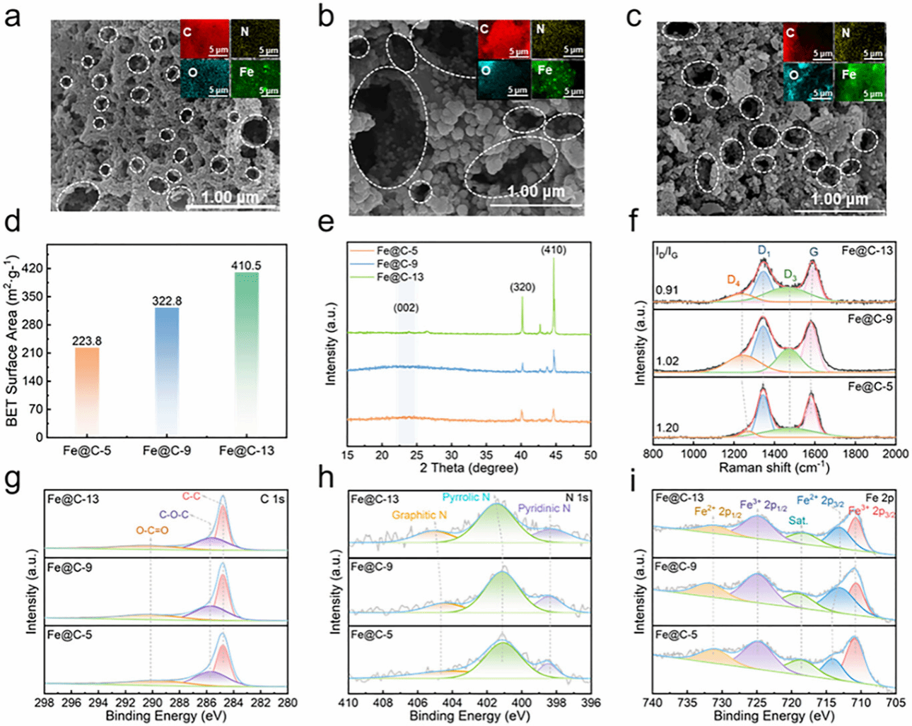 1. 以溶剂热法合成的富氮的MET-6为前驱体,通过梯度Fe3+掺杂与热解,制备出具有分级多孔结构和磁损耗单元(Fe纳米颗粒)的Fe@C纳米材料。这种结构不仅为电磁波提供了丰富的多次反射和散射路径,还通过介电-磁协同损耗机制,极大地增强了电磁波的吸收效率;