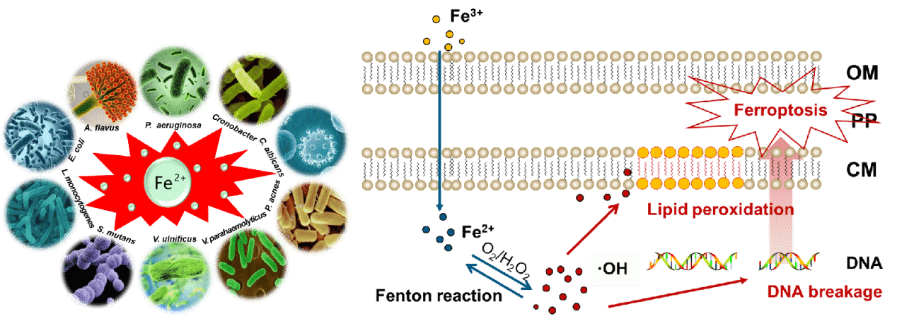 近年来,病原微生物耐药性呈持续增强态势,致使伤口感染治疗面临日益严峻的挑战。陕西科技大学微生物安全与健康创新团队在胡梁斌教授带领下历经多年科研攻关,通过揭示微生物死亡新机制研发出铁基抗菌剂,为全球耐药菌感染防治提供了创新性解决方案。该技术颠覆了传统抗生素依赖上游靶标作用的局限,突破性地作用于微生物死亡的下游共同途径。通过Fenton反应靶向微生物细胞膜和DNA实施高效杀菌,从根本上规避了因上游靶标突变导致的耐药性难题,在病原微生物防控领域实现了从 "靶向治疗" 到 "根源阻断" 的技术革新。相关研究成果已发表于《Biomaterials》《International Journal of Antimicrobial Agents》《Microbiological Research》《Carbohydrate Polymers》等国际 TOP 期刊,并斩获 2 项美国发明专利及 4 项国内授权专利。