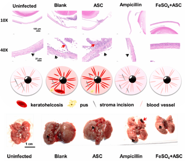 铁基抗菌剂在小鼠细菌性角膜炎模型中表现出卓越治疗效果,既治愈被感染的小鼠眼球伤口,又有效阻止肺部感染