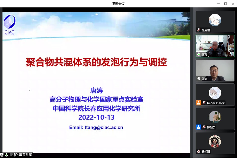 10月13日,受我校科技处、化学与化工学院邀请,中国科学院长春应用化学研究所唐涛研究院做客我校“前沿科学报告”,为我校师生带来题目为“聚合物共混体系的发泡行为与调控”的线上报告。报告由教务处副处长、化工学院邵亮教授主持,相关专业教师、研究生参加了此次报告。
