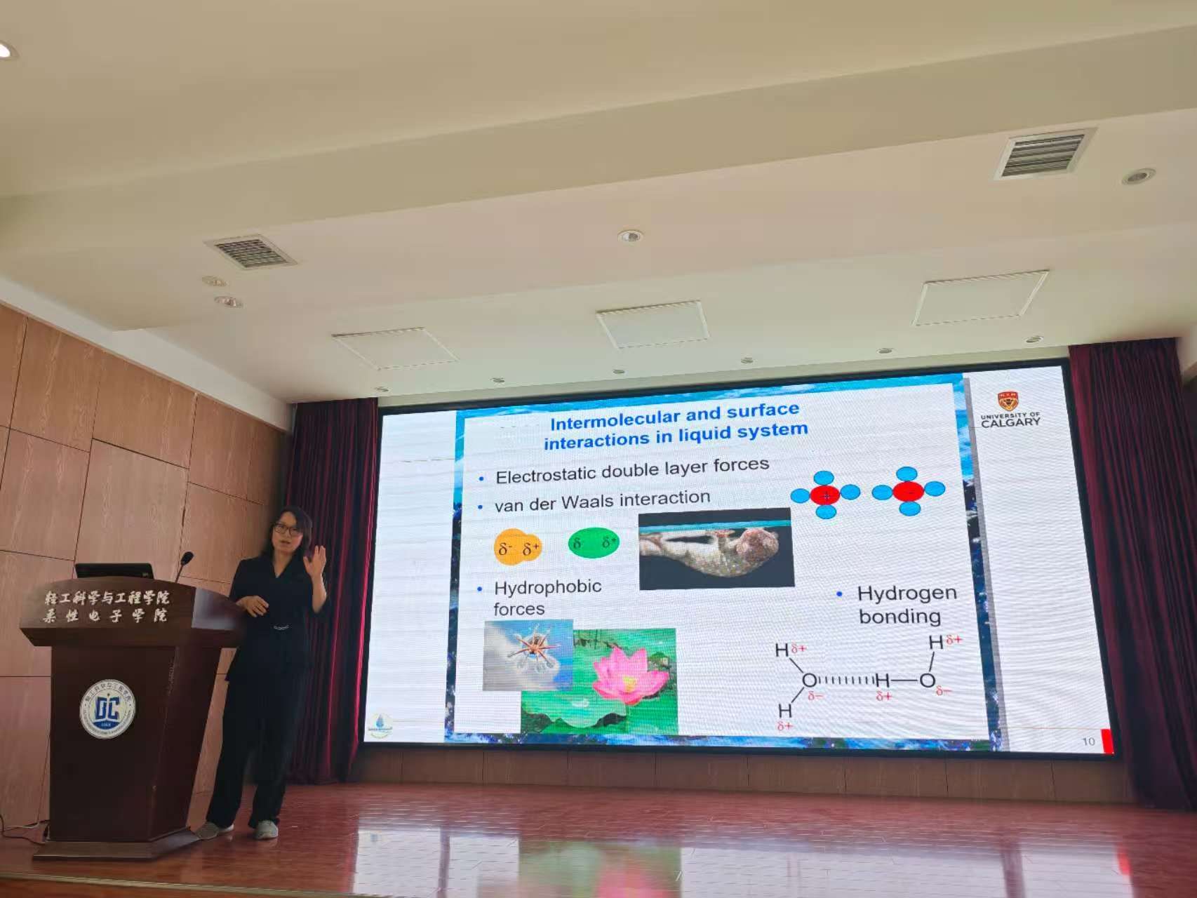 吕清叶教授首先介绍了在加拿大卡尔加里大学的科研环境与实验室建设情况,分享了国际科研工作的经验与感悟。随后,重点阐述了团队在生物聚合物复合材料方面的最新研究成果。通过引入仿生设计理念与分子间相互作用调控,研究团队构建了兼具功能性与可持续性的创新材料体系。在环境治理领域,基于生物混合物的多孔吸附材料展现出高效废水处理、催化及抗菌等应用潜力。在材料设计方面,团队提出“软硬结合”策略:柔性聚合物链赋予材料优异延展性,而刚性纳米粒子提供结构支撑,从而使材料在反复弯折过程中仍能保持稳定性能。