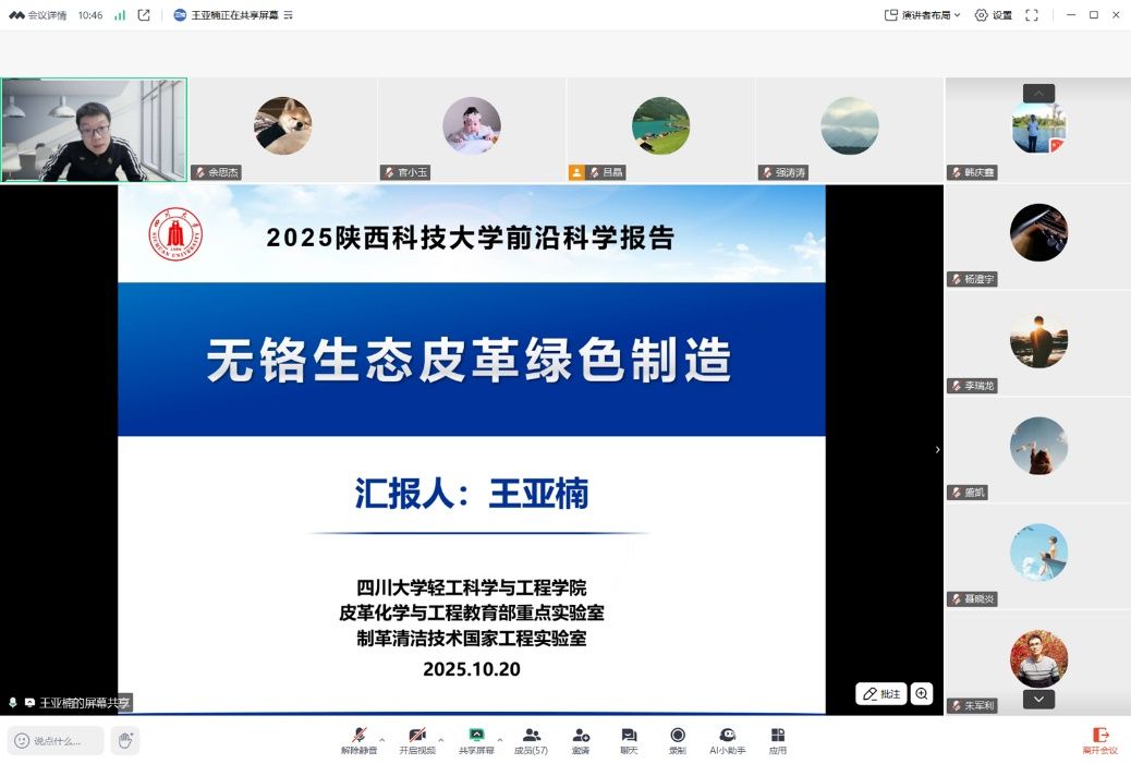 10月21日上午,应科技处、前沿院及轻工科学与工程学院邀请,中国林业科学研究院王奎研究员、四川大学王亚楠教授做客我校“前沿科学报告”,并分别做题为“生物基呋喃化学品低碳高效转化”、“无铬生态皮革绿色制造”的线上学术报告。轻工学院相关专业教师、研究生参加报告会。