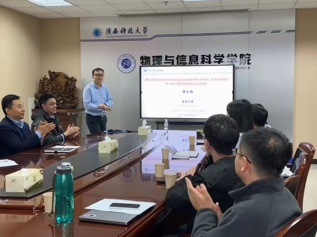 10月17日下午,应我校物理学院、科技处及前沿院邀请,重庆大学物理学院副院长胡自翔教授做客我校“前沿科学报告”,报告题目为“非厄米系统中的双正交动力学量子相变”,报告在理科楼441举行。报告会由物理学院院长张鹏伟教授主持,物理学院相关专业教师及研究生参加了此次报告会。