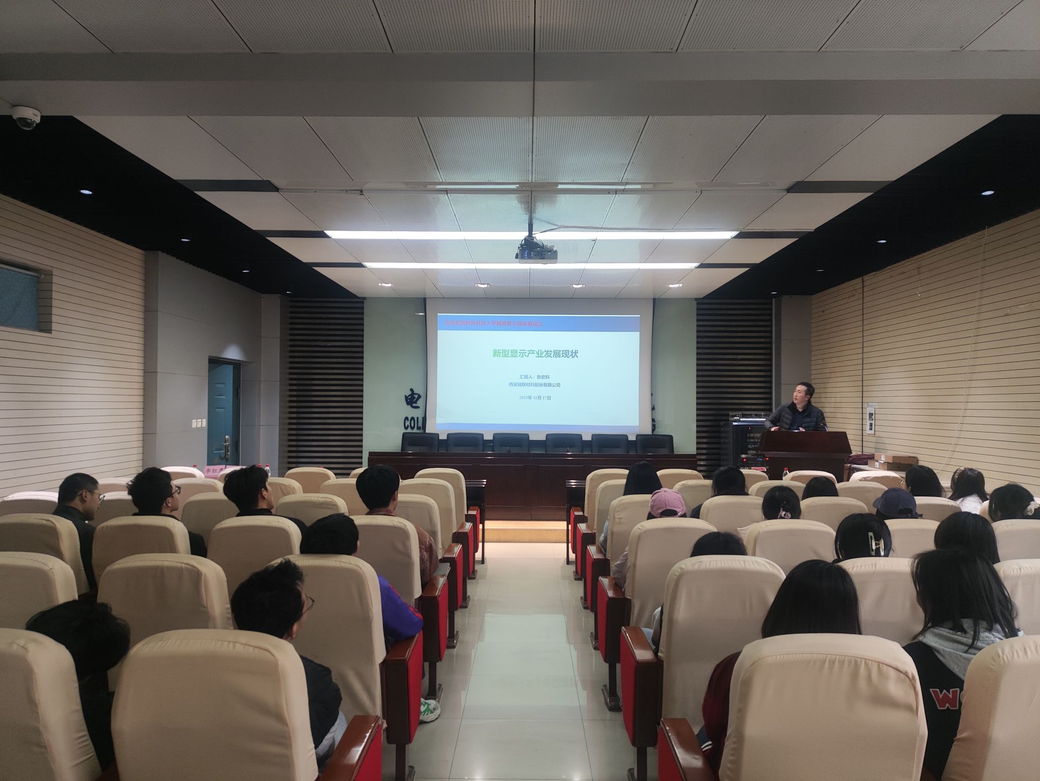 11月17日,西安瑞联新材料股份有限公司OLED材料经理张宏科做客我校“教育教学论坛”,作题为“新型显示产业发展现状”的讲座。会议由电智学院院长助理任喜伟主持,电智学院相关教师和新型显示教改班全体本科生参加。