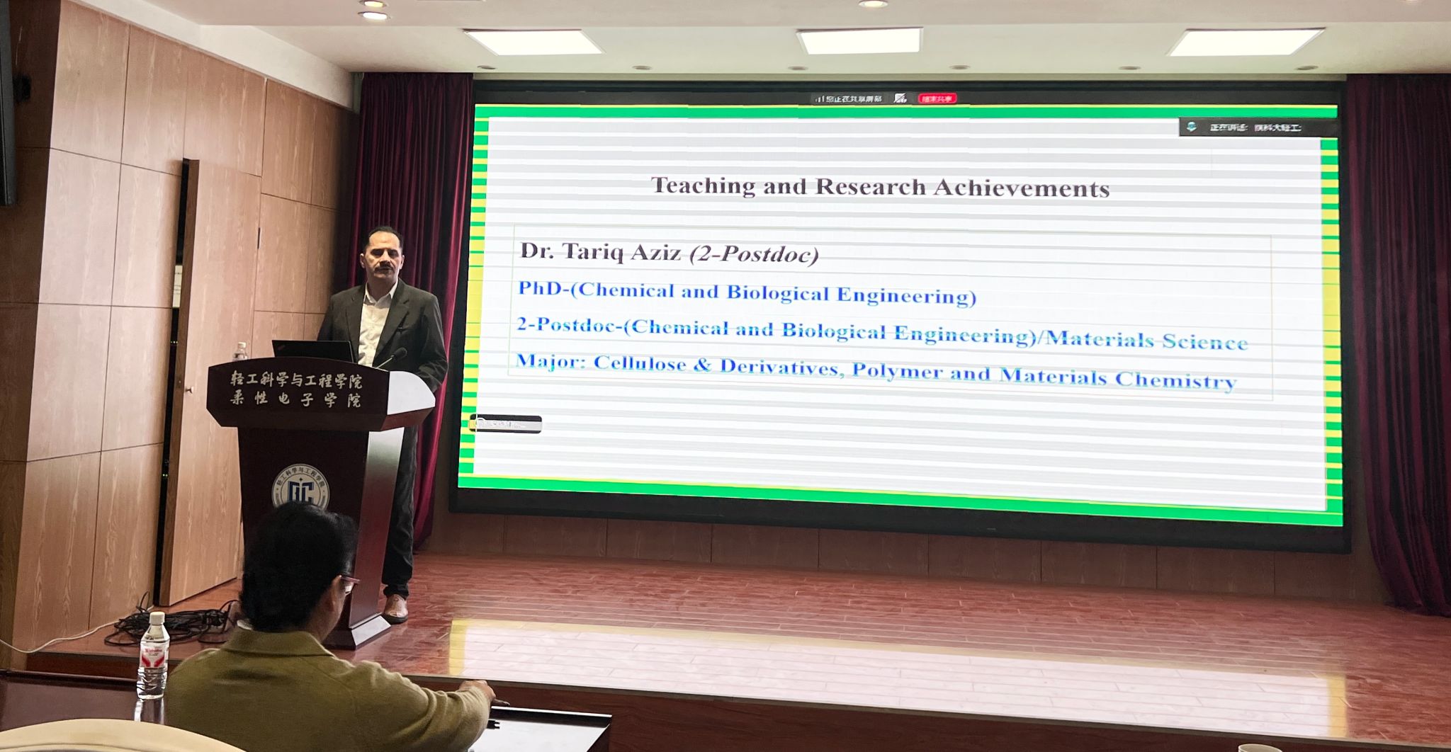 12月4日上午,应轻工科学与工程(柔性电子学院)学院及国际合作与交流处邀请,Tariq Aziz博士做客我校国际教育论坛,作了题为“Synthesis Approaches and Surface Modifications of Cellulose Aerogels for Next-Generation Biomedical Applications”的学术报告。此次会议由张素风教授主持,学院相关专业教师和学生参加了此次报告。